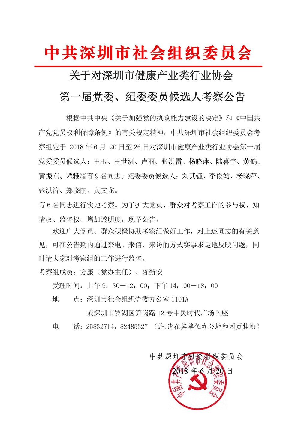 關(guān)于對(duì)深圳市健康產(chǎn)業(yè)類行業(yè)協(xié)會(huì)第一屆黨委、紀(jì)委委員候選人考察公告